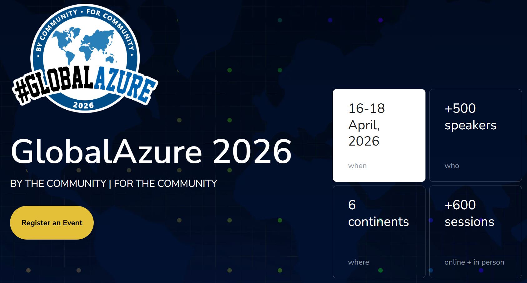 Nei giorni 16, 17 e 18 aprile 2026, le community di tutto il mondo si riuniranno insieme per l’edizione 2026 di Global Azure. In ogni evento ci saranno sessioni su Microsoft Azure, il risultato sarà che migliaia di persone impareranno a conoscere la piattaforma cloud di Microsoft e si uniranno online sotto l’hashtag #GlobalAzure!