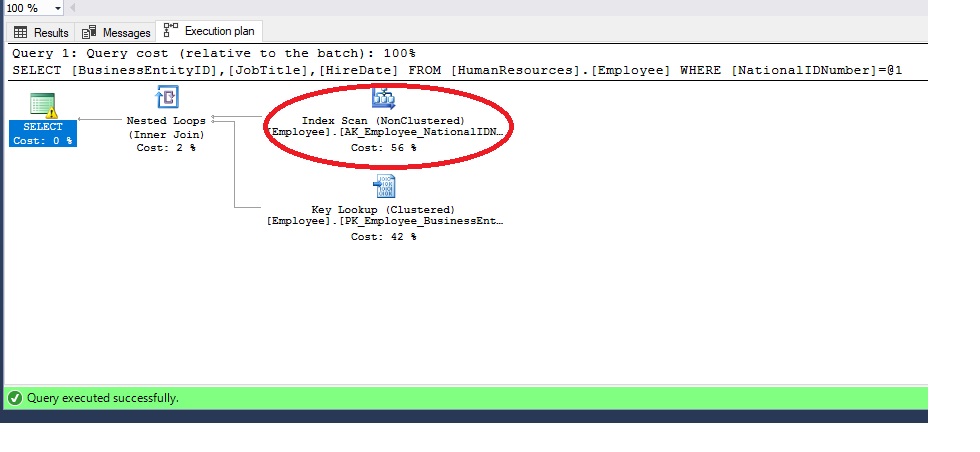 Ad una prima occhiata non sembrerebbe presentare nulla di particolare. Ma in realtà esplorando i dettagli dell’operazione “Index Seek” notiamo che il QP ha applicato la funzione CONVERT_IMPLICIT alla nostra costante riscrivendo di fatto il Seek Predicate. Ciò è dovuto all’utilizzo di un qualificatore di stringa non coerente con il tipo dato della colonna “NationalIDNumber” (NVARCHAR(15)). In particolare abbiamo utilizzato una stringa delimitata da apici singoli (‘112457891’) la quale viene identificata dal sistema come una stringa non-Unicode, mentre avremmo dovuto utilizzare una stringa delimitata da apici preceduti da una lettera N (maiuscola) (N'112457891’) la quale indica invece una stringa di caratteri Unicode e quindi in accordo con il tipo dato della colonna.