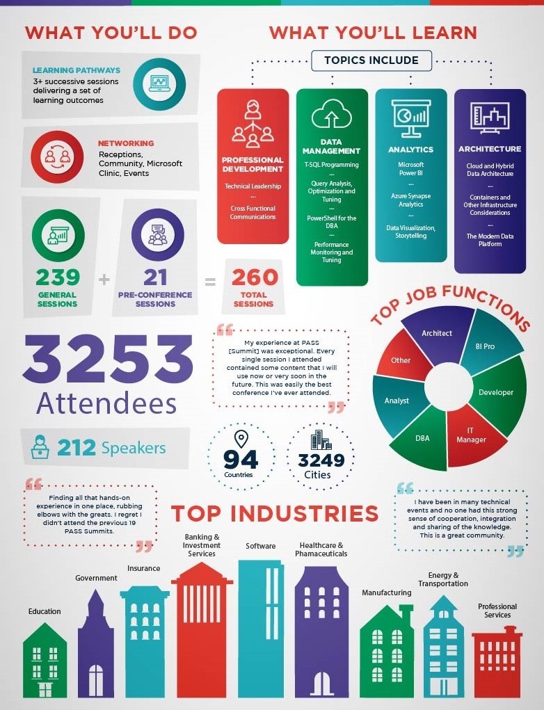 La figura seguente schematizza quali attività potrete fare e quali competenze potrete acquisire durante il PASS Virtual Summit 2020 (le statistiche sul numero di partecipanti, sui paesi di provenienza e sulle relative città, ecc.. sono riferiti all’edizione 2019).