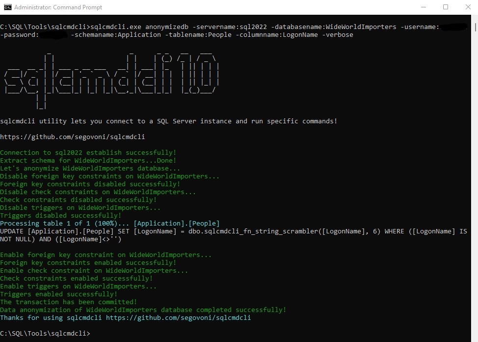 sqlcmdcli.exe anonymizedb -servername:sql2022 -databasename:WideWorldImporters -username:xxxxx -password:xxxxx -schemaname:Application -tablename:People -columnname:LogonName -verbose