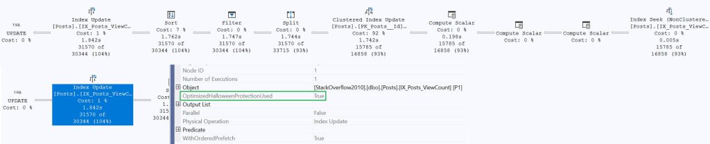 Si noti l’impostazione a True dell’opzione OptimizedHalloweenProtectionUsed tra i dettagli degli operatori Index Update e Clustered Index Update.